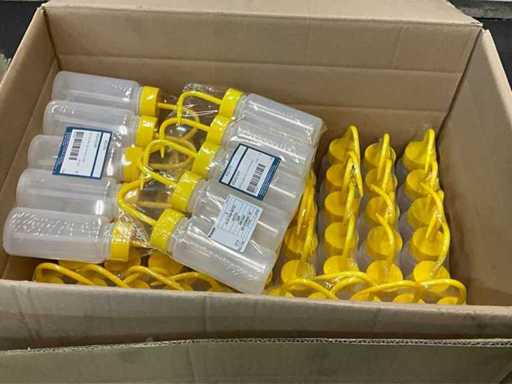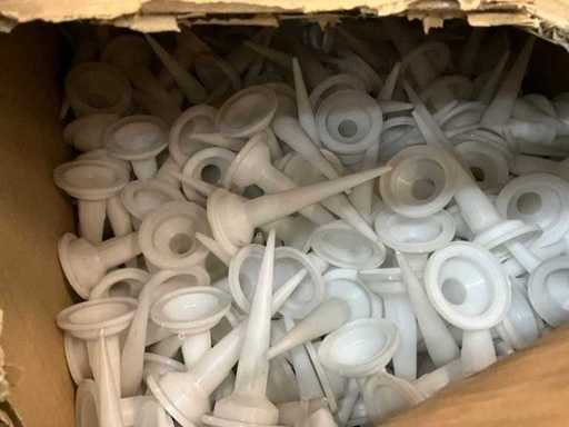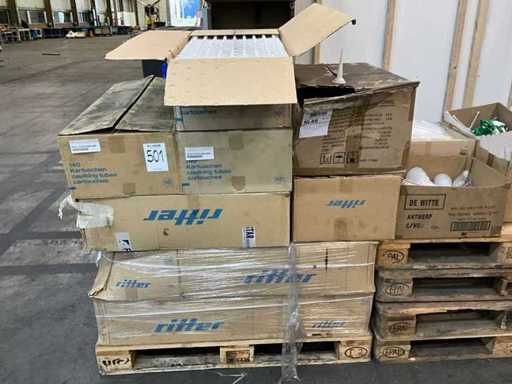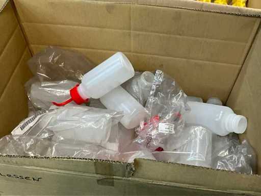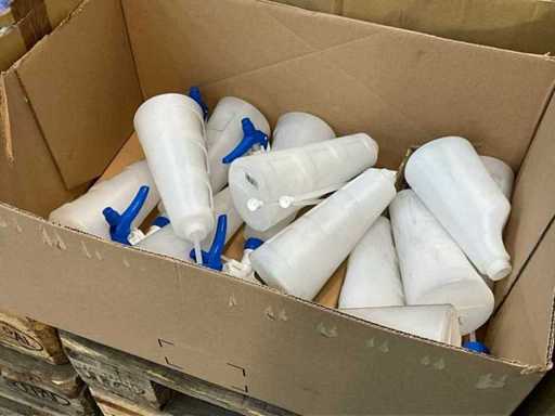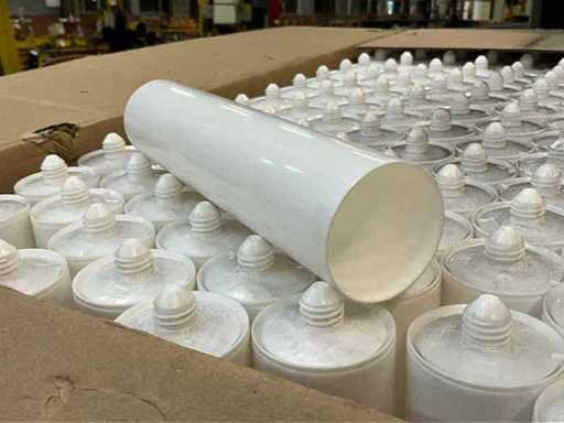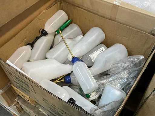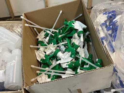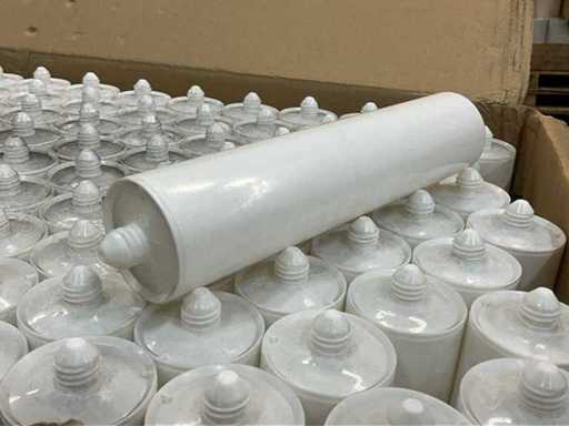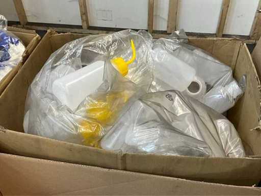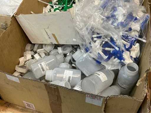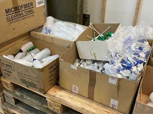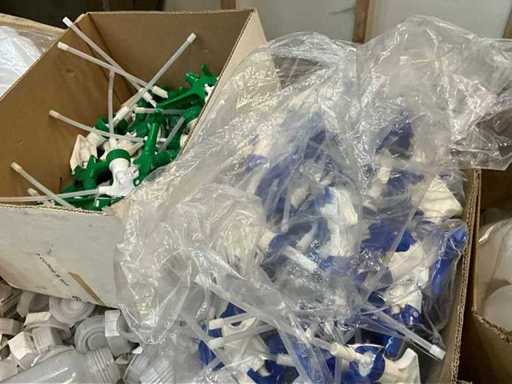 Kunststoff; darunter 1500 Ritter befüllbare Silikonpatronen ohne Boden; 1x Schachtel Düsen für Silikonpatronen; verschiedene Plastikdosierkanister / Aerosole; auf und mit 1 Palette und in 7 Kisten ohne Paletten;