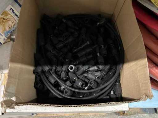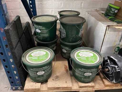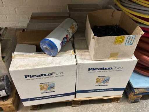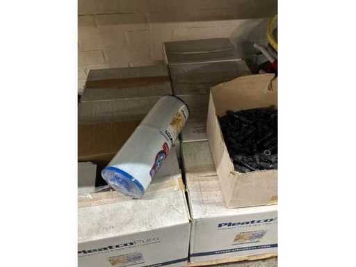 Dazu gehören: verschiedene elektrische Teile, verschiedene Befestigungsmaterialien, verschiedene Schläuche, 7x Box PleatcoPure Filterpatrone, 1x Box Universal Stone, 9x Eimer etwa 4 kg Universal Stone