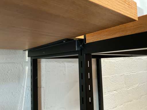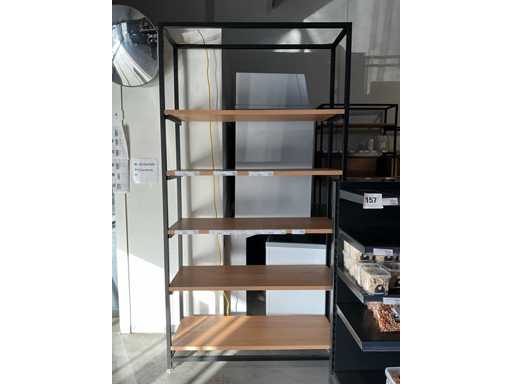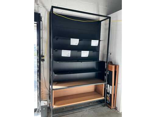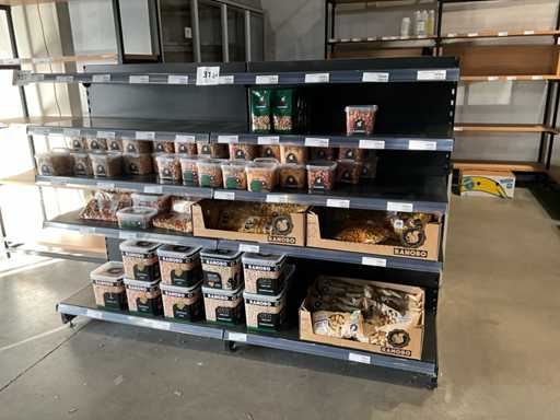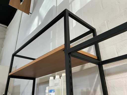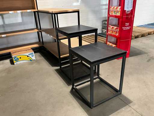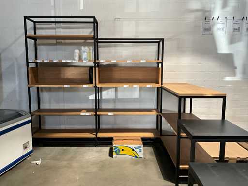 Dazu gehört ein Gondelhalter mit 2x 5 Regalen, 2x Beistelltisch mit den Maßen 60x60 cm, Höhen 60 und 93 cm, Metalleckmöbel mit den Maßen: 315x172x250cm, 2 verschiedene Metallregale mit den Maßen 130x45x250cm, ohne Inhalt
