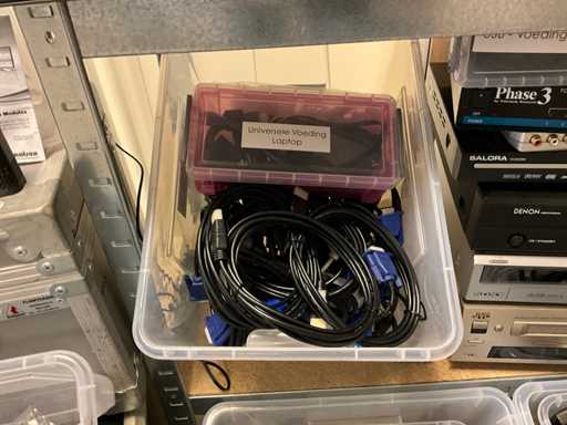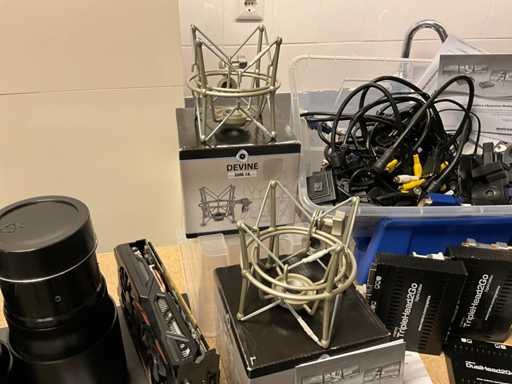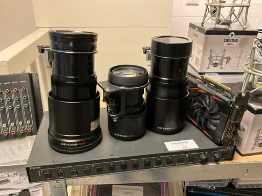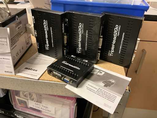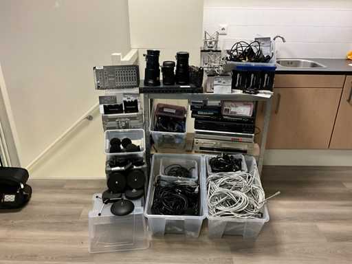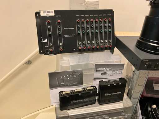 Inklusive 3x TripleHead2Go Digital Edition; 1x DualHead2Go; 1x TripleHead2Go DP Edition; 1x TripleHead2Go Digital SE; 2x Mikrofonaufhängung; "Gigabyte" GV-N105TWF20C4GD-Grafikkarte; "Extron" MPS 112 Medienpräsentation Umschalter; 3 "Barco"-Objektive; Audio-Video-Verteilverstärker; NFC-Tag-Leser + Karte; Apple-Fernbedienungen; Timecode-Umformer; USB-Stromversorgung (5 Volt); universelles Laptop-Netzteil; 2 DVD-Player "Salora"; 1 "Denon" Spezial-DVD-Player; 6 Mikrofontischständer; 10 Mikrofonklemmen; 4 Windschutzscheiben; 2 Flightcases; "Sony" DVD-Recorder; "JVC" Super VHS; UTP-Kabel; Euro-Stecker; Adapterkabel für Sender; VGA-Kabel