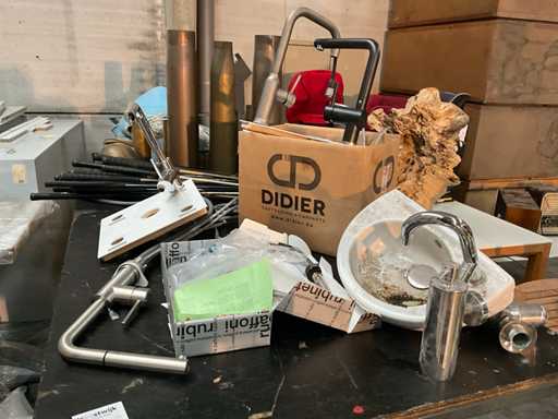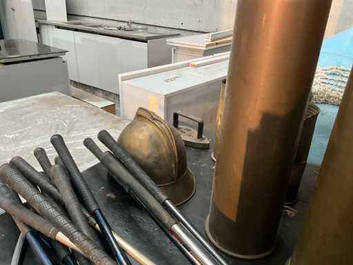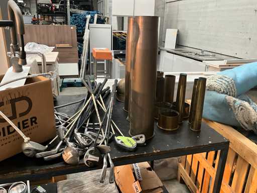Bestehend aus 6x doppelt versenkten Punkten mit den Maßen 33x18 cm, einer Charge verschiedener Wasserhähne und Waschbecken + Spüle, + etwa 20 Golfschläger + Charge von Kupferbombengranaten in verschiedenen Höhen 8-62 cm + Kupferhelm, +1x 4-Punkt-Elektrokoben, kurz gesagt, alles auf und im Wagen