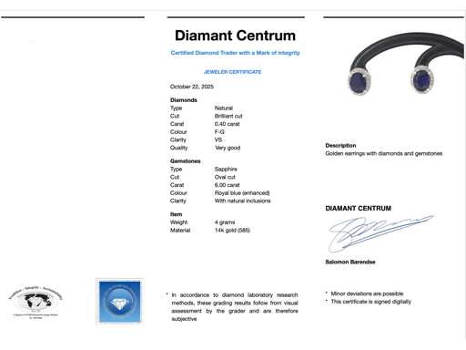 Saphir Diamant: Natürlich; Schnitt: Brillantschnitt; Gewicht (Karat): 0,40 Karat; Farbe: F-G; Reinheit: USA; Schnittqualität: Sehr schön; Edelstein: Saphir; Menge: 2 Stück; Schnitt: Oval; Gewicht (Karat): 6,00 Karat; Farbe: Königsblau (verstärkt); Reinheit: Mit natürlichen Einschlüssen (verstärkt); Juwel: Ohrringe; Gewicht: 4 Gramm; Material: 14 Karat (585); Zustand: Neu; Verpackung: Luxus-Schmuckschatulle; Erklärung: Die Qualität wurde aus dem Bericht übernommen, der zum Artikel gehört. Die Bewertung ist eine Bewertung eines zertifizierten Diamanthändlers, basierend auf Verbraucherpreisen; Verbraucherpreis: 3.760 €.
