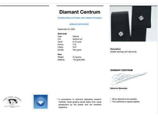Diamant Diamant: Natürlich; Menge: 2 Stück; Schnitt: Brillantschnitt; Gewicht (Karat): 0,10 Karat; Farbe: F-G; Reinheit: SI-P; Schnittqualität: Sehr schön; Juwel: Ohrringe; Gewicht: 0,3 Unzen; Material: 14 Karat (585); Zustand: Neu; Verpackung: Luxus-Schmuckschatulle; Erklärung: Die Qualität wurde aus dem Bericht übernommen, der zum Artikel gehört. Die Bewertung ist eine Bewertung eines zertifizierten Diamanthändlers, basierend auf Verbraucherpreisen; Verbraucherpreis: 665 €.