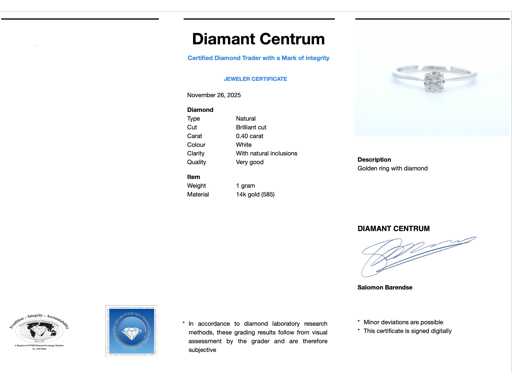 Diamant: Natur; Menge: 1 Stück; Schnitt: Brillantschnitt; Gewicht (Karat): 0,40 Karat; Farbe: Weiß; Reinheit: Mit natürlichen Einschlüssen; Schnittqualität: Sehr schön; Juwel: Ring; Gewicht: 1 Gramm; Ringgröße (maßgefertigt*): 54 (17,25 mm); Material: 14 Karat Gold (585); Zustand: Neu; Verpackung: Luxus-Schmuckschatulle; Erklärung: Die Qualität wurde aus dem Bericht übernommen, der zum Artikel gehört. Die Bewertung ist eine Bewertung eines zertifizierten Diamanthändlers, basierend auf Verbraucherpreisen; Verbraucherpreis: 1.500 €