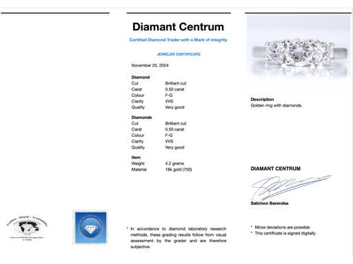 Diamant: Natur; Menge: 1 Stück; Schnitt: Brillantschnitt; Gewicht (Karat): 0,50 Karat; Farbe: F-G; Reinheit: VVS; Schnittqualität: Sehr schön; Diamant (Sekundärspieler): Diamanten; Anzahl der Karo: 2 Figuren; Schnitt: Brillantschnitt; Gewicht (Karat): Gesamtgewicht 0,50 Karat; Farbe: F-G; Reinheit: VVS; Schnittqualität: Sehr schön; Juwel: Ring; Gewicht: 4,2 Unzen; Ringgröße (maßgeschneidert*): 53 (17 mm); Material: 18K Gold (750); Zustand: Neu; Verpackung: Luxus-Schmuckschatulle; Erklärung: Die Qualität wurde aus dem Bericht übernommen, der zum Artikel gehört. Die Bewertung ist eine Bewertung eines zertifizierten Diamanthändlers, basierend auf Verbraucherpreisen; Verbraucherpreis: 11.900 €