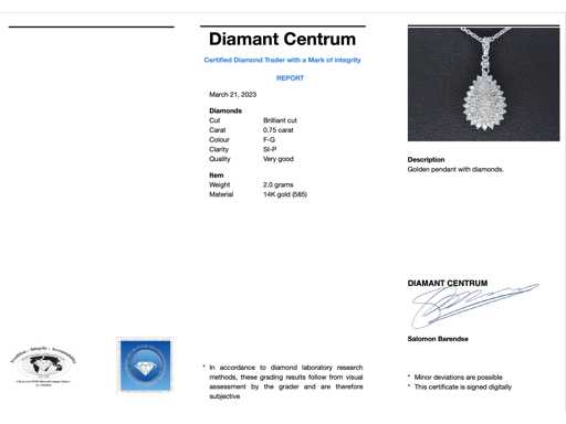 Diamanten Diamant: Natürlich; Schnitt: Brillantschnitt; Gewicht (Karat): 0,75 Karat; Farbe: F-G; Reinheit: SI-P; Schnittqualität: Sehr schön; Juwel: Anhänger (ausgenommen Halskette); Gewicht: 2 Gramm; Maße/Länge: 20 mm; Material: 14 Karat (585); Zustand: Neu; Verpackung: Luxus-Schmuckschatulle; Erklärung: Die Qualität wurde aus dem Bericht übernommen, der zum Artikel gehört. Die Bewertung ist eine Bewertung eines zertifizierten Diamanthändlers, basierend auf Verbraucherpreisen; Verbraucherpreis: 2.765 €