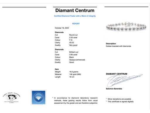 Diamant: Natur; Stückzahl: 392 Stück; Schnitt: Rundschnitt; Gewicht (Karat): 2,00 Karat; Farbe: F-G; Reinheit: VS-SI; Schnitt: wunderschön; Diamant (Sekundärspieler): Schwarzer Diamant; Anzahl der Diamanten: 28 Stücke; Schnitt: Brillantschnitt; Gewicht (Karat): 3,80 Karat; Farbe: Schwarz (verstärkt); Reinheit: Undurchsichtig; Schnitt: Wunderschön; Juwel: Armband; Gewicht: 16,5 Unzen; Abmessungen/Länge: 18 cm; Material: 14 Karat Gold (585); Zustand: Neu; Verpackung: Luxus-Schmuckschatulle; Erklärung: Die Qualität wurde aus dem Bericht übernommen, der zum Artikel gehört. Die Bewertung ist eine Bewertung eines zertifizierten Diamanthändlers, basierend auf Verbraucherpreisen; Verbraucherpreis: 13.965 €