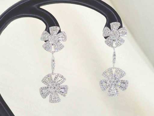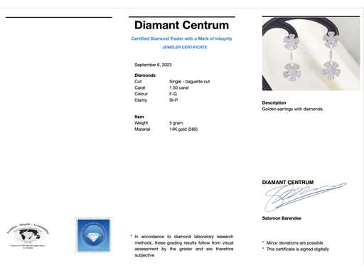 Diamant: Natürlich; Schnitt: Single ground & baguette cut; Gewicht (Karat): 1,50 Karat; Farbe: F-G; Reinheit: SI-P; Juwel: Ohrringe; Gewicht: 5 Gramm; Abmessungen/Länge: ca. 40 mm; Material: 14 Karat Gold (585); Zustand: Neu; Verpackung: Luxus-Schmuckschatulle; Erklärung: Die Qualität wurde aus dem Bericht übernommen, der zum Artikel gehört. Die Bewertung ist eine Bewertung eines zertifizierten Diamanthändlers, basierend auf Verbraucherpreisen; Verbraucherpreis: 6.930 €
