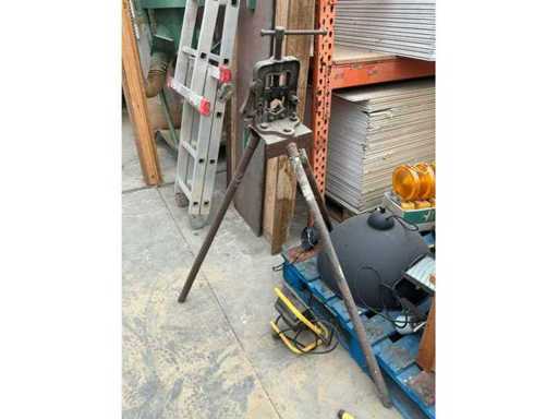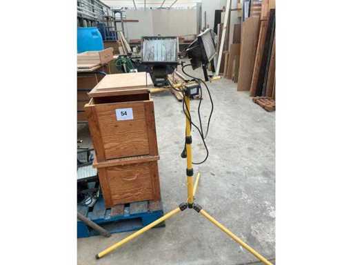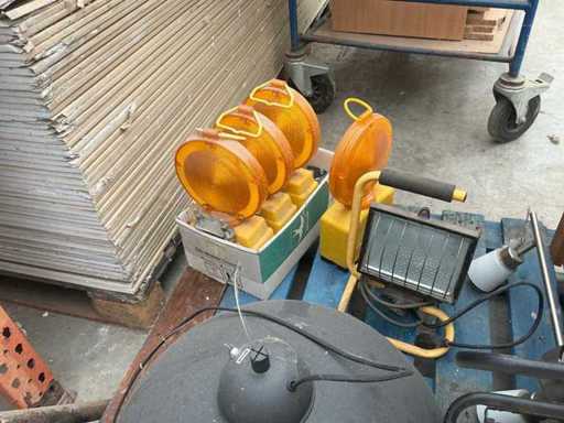 Einschließlich Rohrklemme auf dem Stativ, 4 verschiedene Halogen-Arbeitsleuchten einschließlich eines Stativs, 4x Signallampe, 2 verschiedene Deckenleuchten und 2x Holzkisten, Maße: 83 x 45 x 40 cm