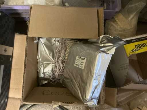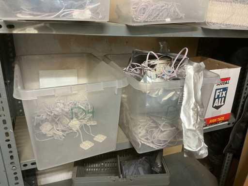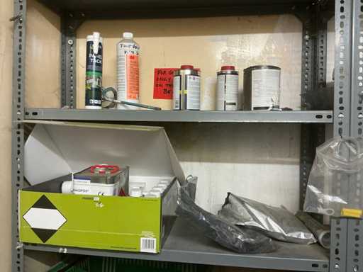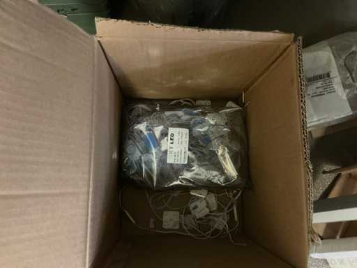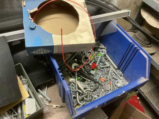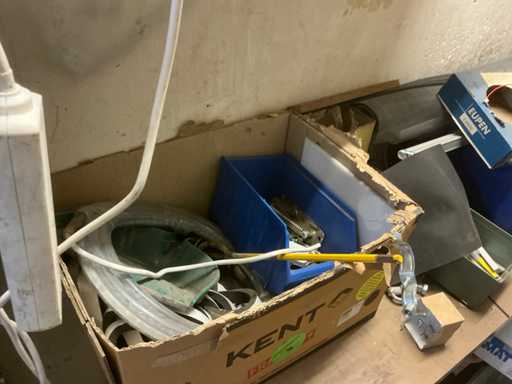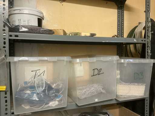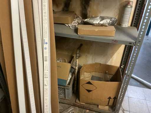 Bestehend aus 4 verschiedenen Metalllagerregalen, darunter ca. 185 x 32 x 200 cm, komplett mit Inhalt, einschließlich verschiedener elektrischer Zubehörchargen, Einzelmontagematerial und so weiter