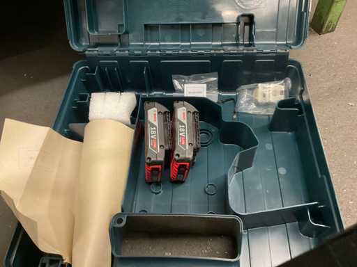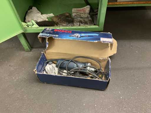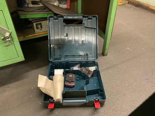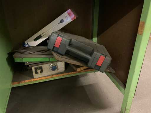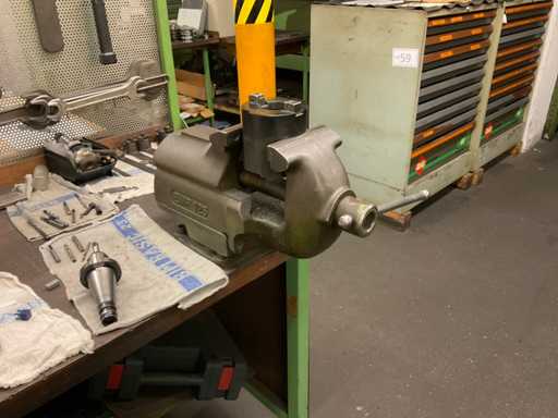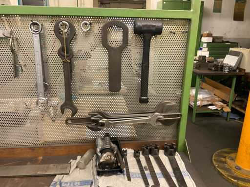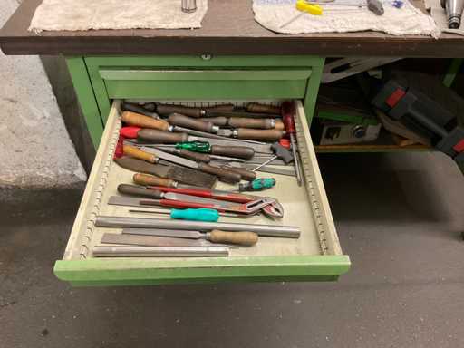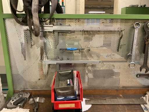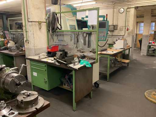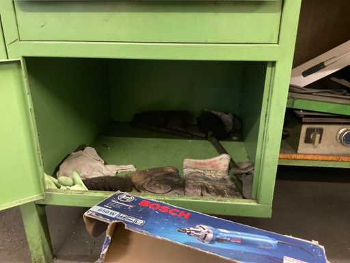 Werkbank mit Rückwand und Unterschrank 1-türig 2-zügig, mit Inhalt, bestehend aus: u.a. BOSCH Gradschleifer, div. Maul- und Ringschlüsseln, Kabeltrommel, Schraubstock, Winkelschleifer, div. Analogmessschieber