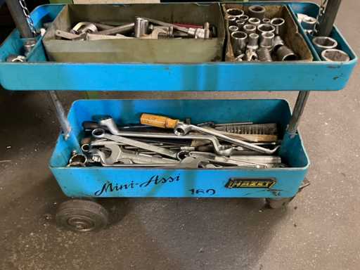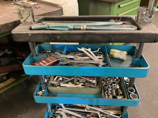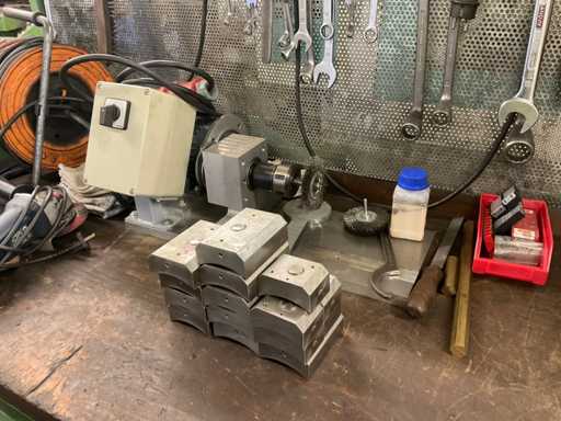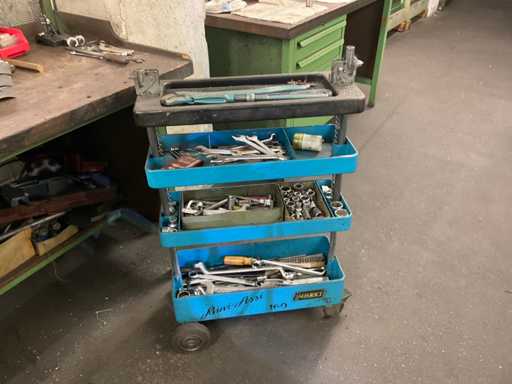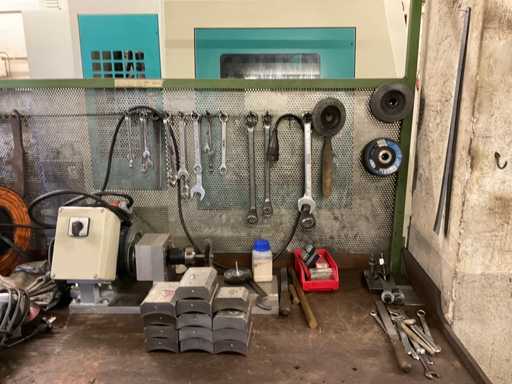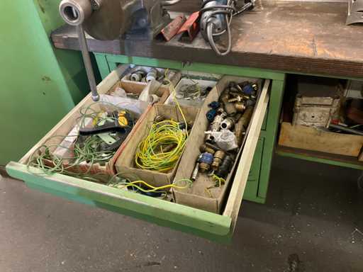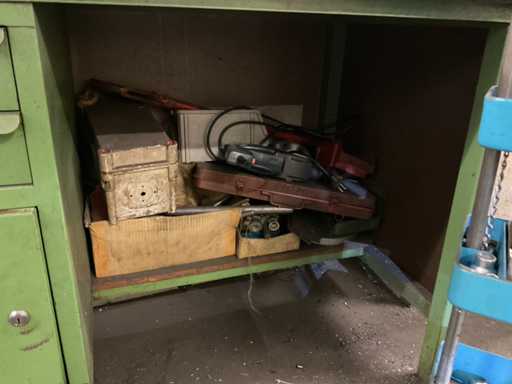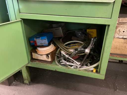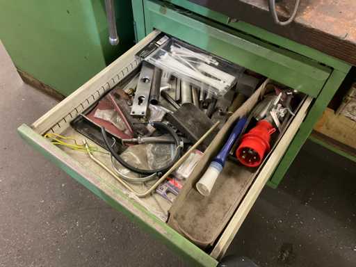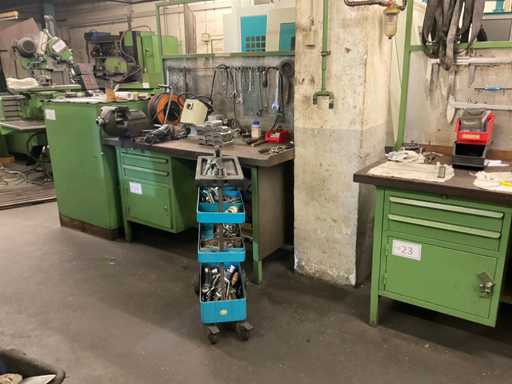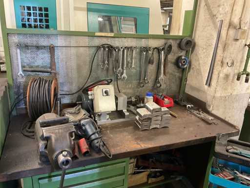 Werkbank mit Rückwand und Unterschrank 1-türig 2-zügig, mit Inhalt, bestehend aus: u.a. HAZET Werkstattwagen, div. Maul- und Ringschlüsseln, Kabeltrommel, Schraubstock, Winkelschleifer, Wasserpumpenzangen, OHNE Poliermaschine