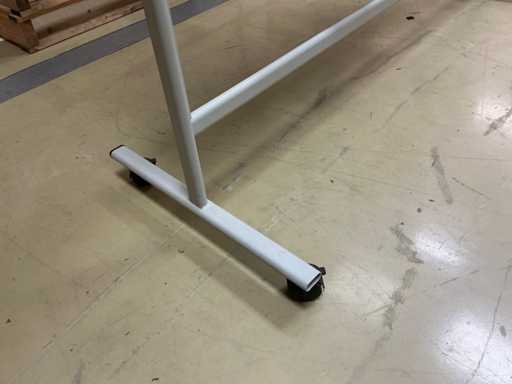 Die doppelseitige, kippbare Platte ist 150x120 cm groß; ausgestattet mit 4 schwenkbaren Rädern mit Bremsen