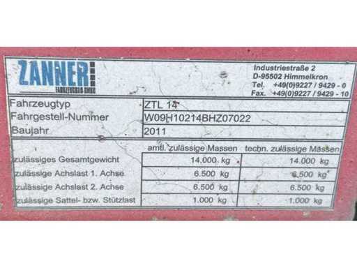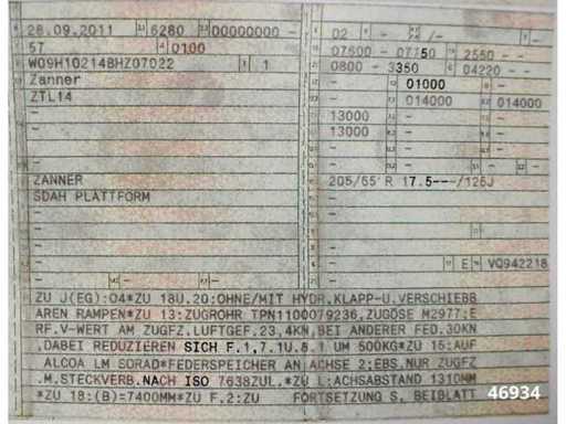 Interne Nummer: 46934, Tandemanhänger Zanner ZTL 14 für Steckverbindung, Baujahr: 2011, Erstzulassung: 28.09.2011, Fahrgestell-Nummer: W09H10214BHZ07022, Eigengewicht: 4.220 kg, Zulässiges Gesamtgewicht: 14.000 kg, Nutzlast: 9.780 kg, Länge: 7,60-7,75 m, Breite: 2,55 m, Höhe: 0,80 - 3,35 m