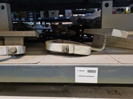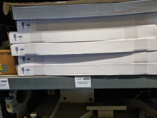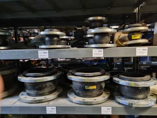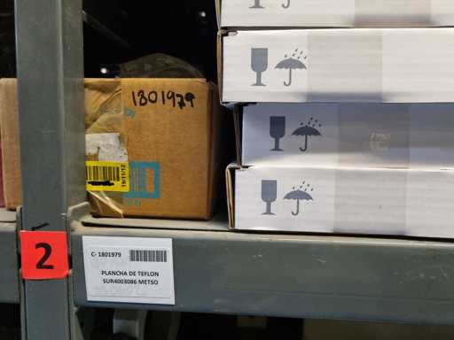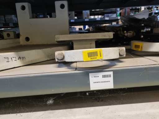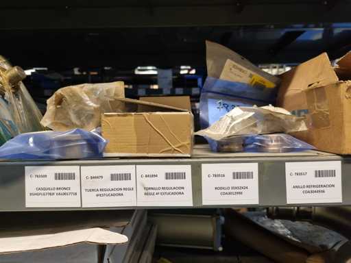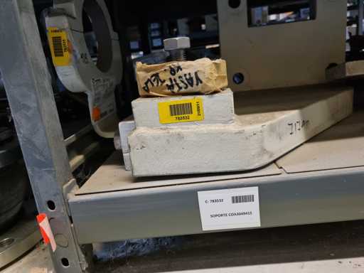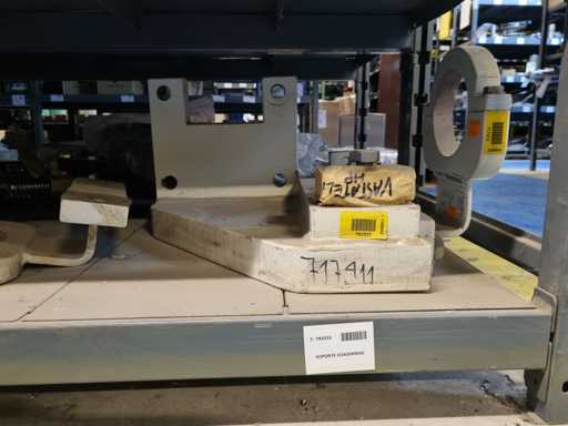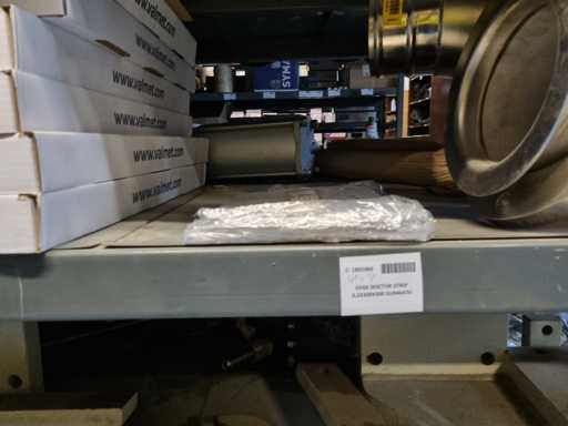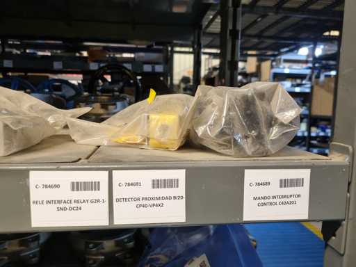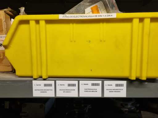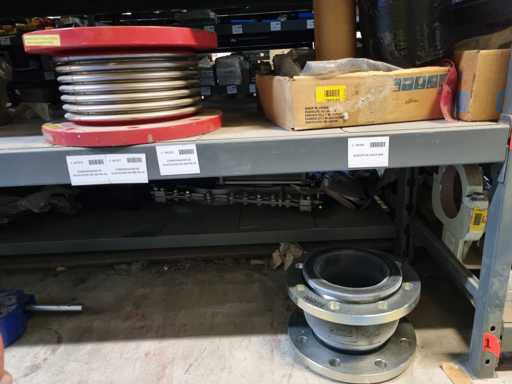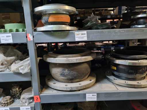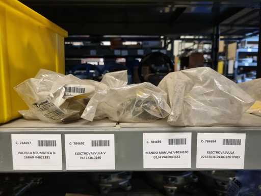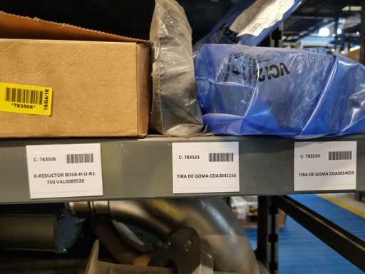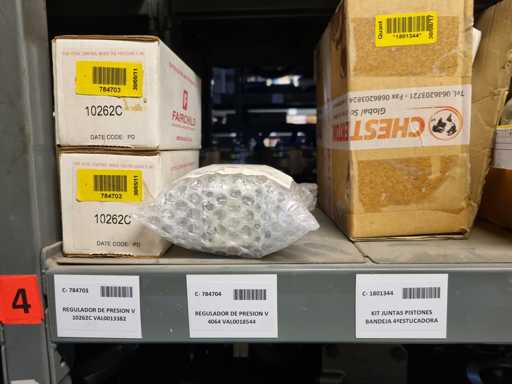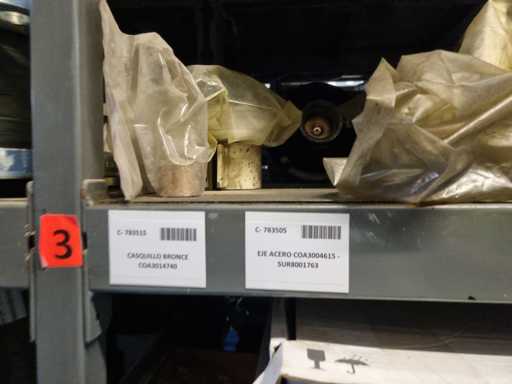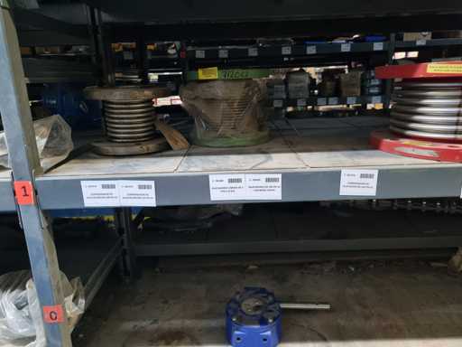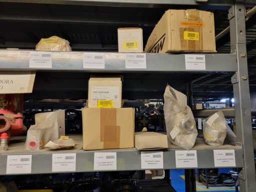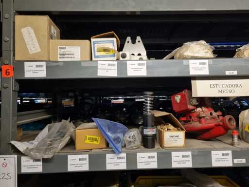 - Shelving not included: Only the spare parts and materials visible on the shelf marked in red in the first photograph are delivered. The metal structure is not part of the lot.