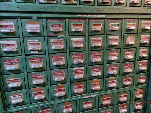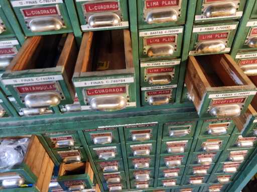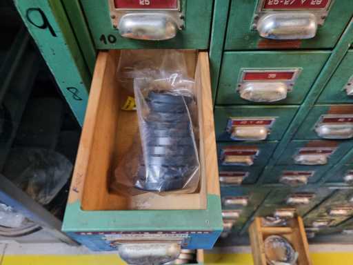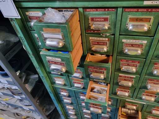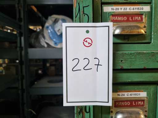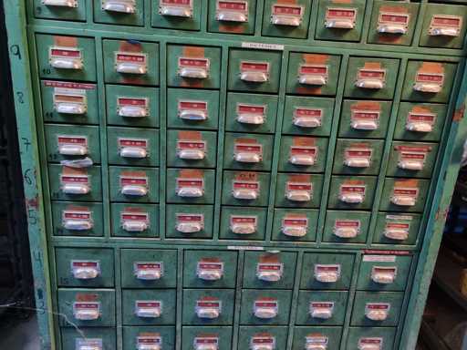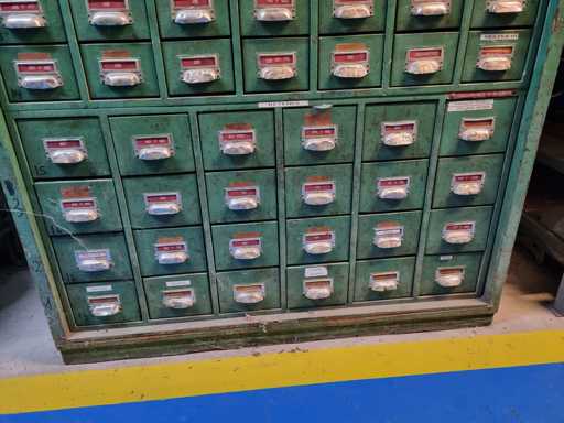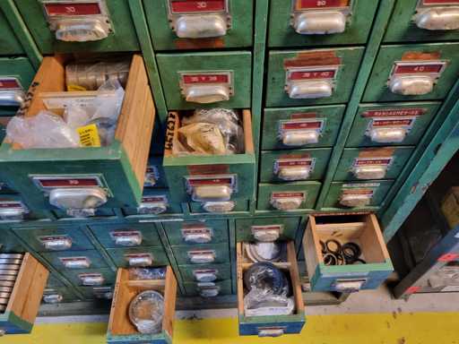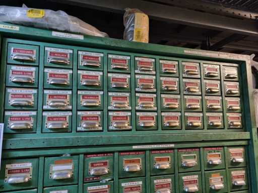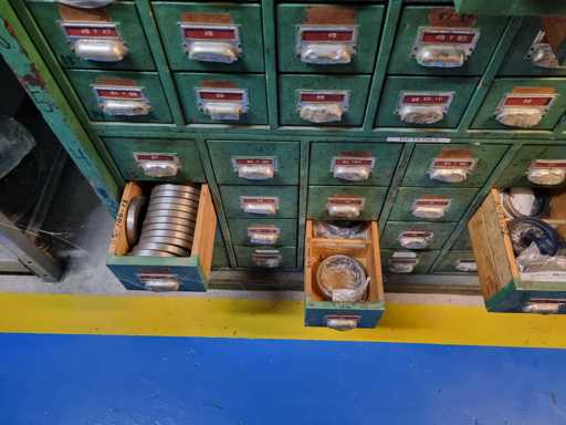 - Shelving not included: Only the spare parts and materials visible on the shelf marked in red in the first photograph are delivered. The metal structure is not part of the lot.