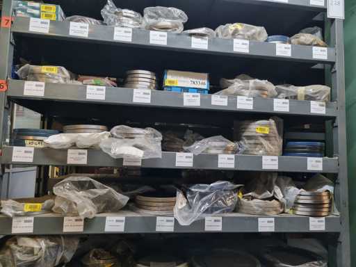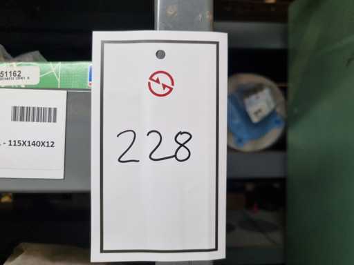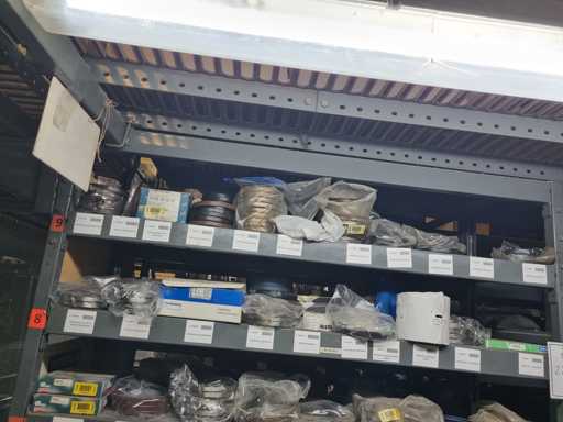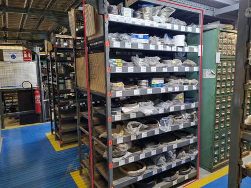 - Shelving not included: Only the spare parts and materials visible on the shelf marked in red in the first photograph are delivered. The metal structure is not part of the lot.