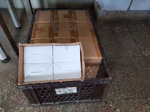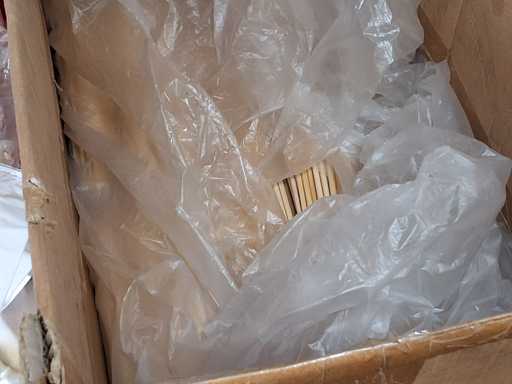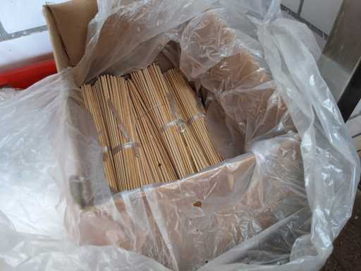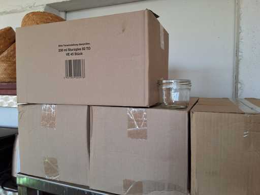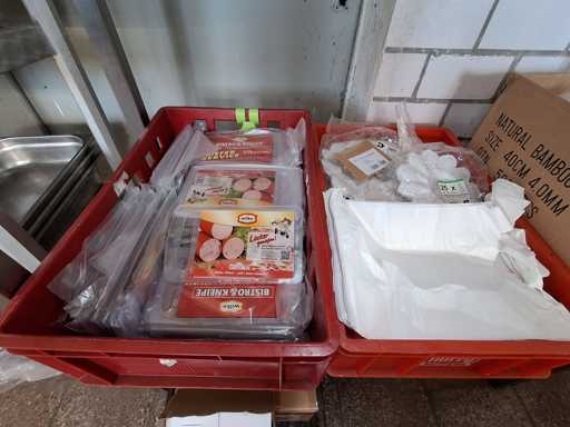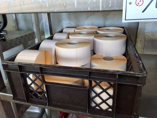 Stainless steel shelf with contents, tumblers + breakfast boards, parchment packaging, label rolls, wooden skewers, toothpicks, carrying bags + loop labels