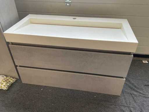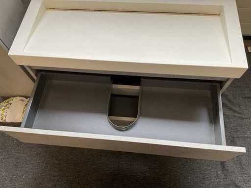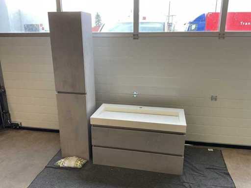 Consisting of: 1x sink with tap hole, matte, L100xW45.5cm, 1x base cabinet with 2x soft-close drawer, 1x mirror with lighting, L100xB70xD3.5cm and 1x high wall cabinet with 2x soft-close door and glass shelves, H165xW35xD29cm.