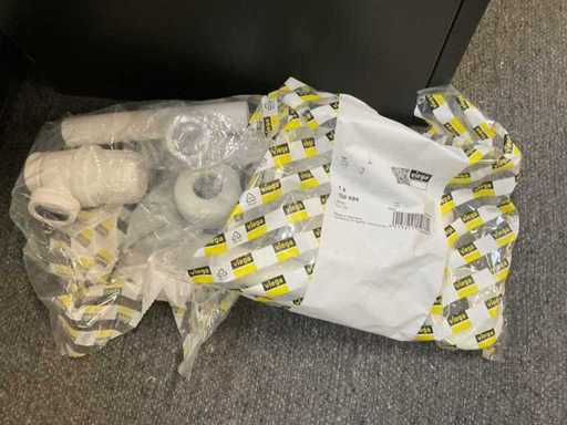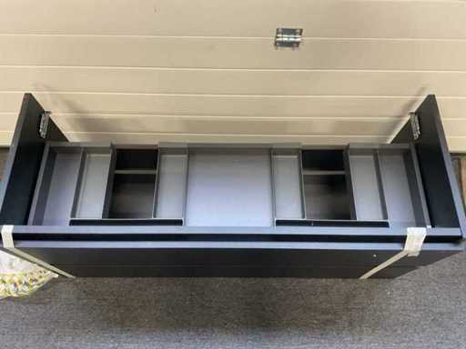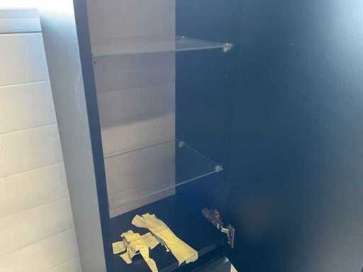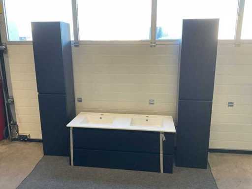Consisting of: 1x double sink with tap hole and overflow, white, L121.5xW46.5cm, 1x mirror with lighting + heating, D=100cm, 1x base cabinet with 2x soft-close drawer, 2x high wall cabinet with 2x door and glass shelves, H165xW35xD30cm and 2x Viega siphon, type 108 694.