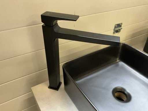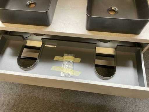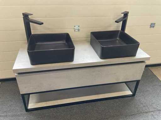 Consisting of: 2x countertop washbasin, matte black, 38x37x13cm, 1x base cabinet with 1x soft-close drawer and 1x shelf, 1x mirror with lighting + heating, L120xB70xD3.5cm and 2x Hansgrohe single-lever basin mixer tap, matte black, model Metropol, type P-IX 7295/IO.