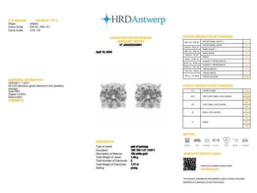 18k white gold earrings with 1.01 ct round diamonds - (HRD certified)
