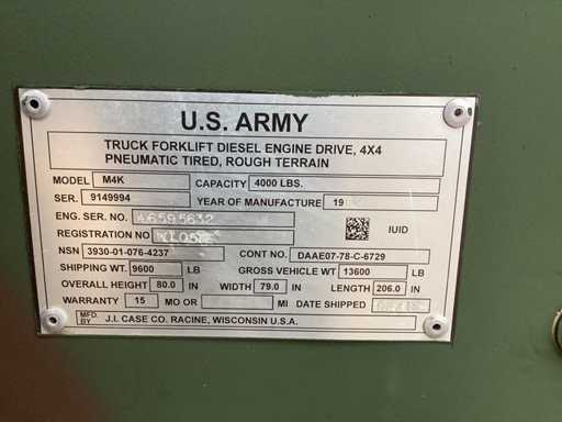 Drained; operation unknown; CNH diesel engine; 4 cylinder; capacity 4000 lbs; own weight 9600 kg;
