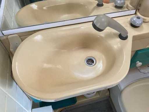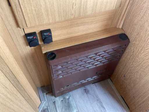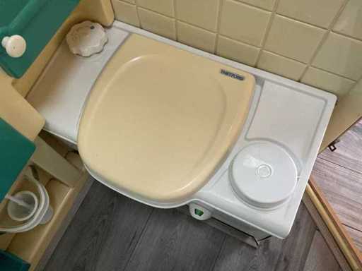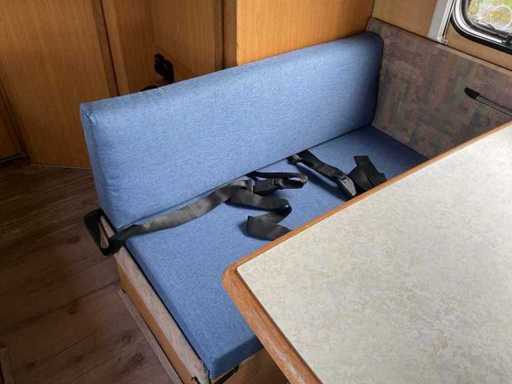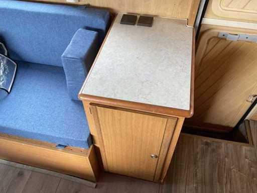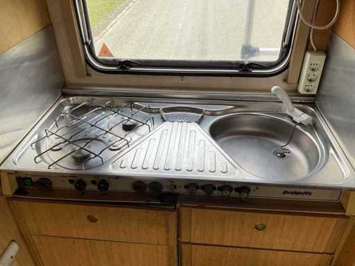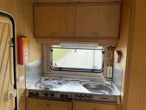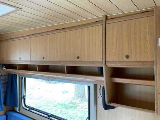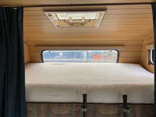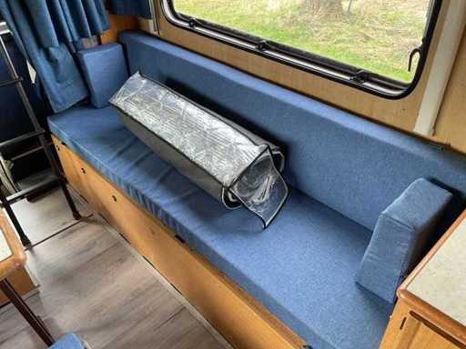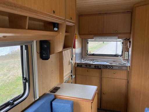 v.v. radio; kitchen unit; 2-burner gas stove; refrigerator; sitting area, possibility to convert into a bed; stairs; sleeping place upstairs; roof hatch; stove; toilet; wastfafel; storage cupboards; bicycle rack; canopy; rear air springs