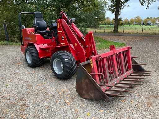 Equipped with 4-Cil. "Kubota" diesel engine; Hydraulic quick coupler; 3rd hydraulic function; work lighting; hydrostat; new BKT tyres; including soil bucket approx. 1850 mm wide / manure fork;