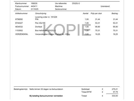 Het afhalen van de gekochte goederen gaat als volgt: Na ontvangst van je betaling wordt er door de verkoper contact met je opgenomen om een afhaal afspraak te maken. Het exacte adres zul je dan ontvangen. De plaats en provincie waar de kavels zich bevinden, wordt aangegeven bij het kavel. De minimumleeftijd voor het bezoeken van de ophaaldagen is 18 jaar. Bezoekers moeten zich kunnen identificeren. Er is geen herroepingsrecht. Zie de Veilingvoorwaarden voor meer informatie. Voor deze veiling wordt geen kijkdag georganiseerd. Voor elk kavel wordt er € 100, - administratiekosten in rekening gebracht.