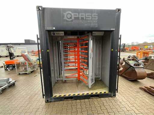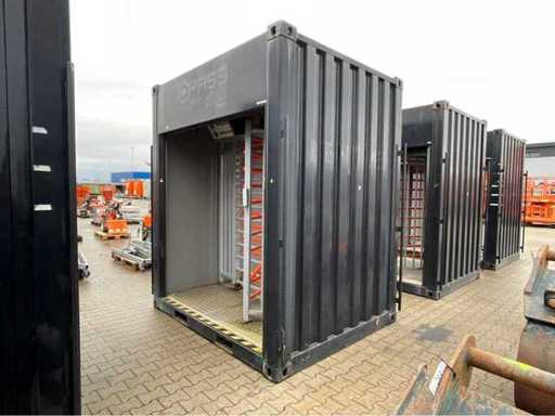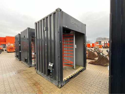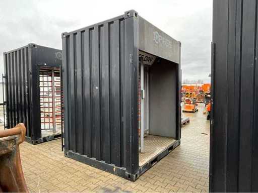 mounted in shipping container; equipped with 1x full long side roller door; equipped with lighting; 1x access passage; power connection 230 Volt; twistlocks; forklift fork slots; not working; incomplete;