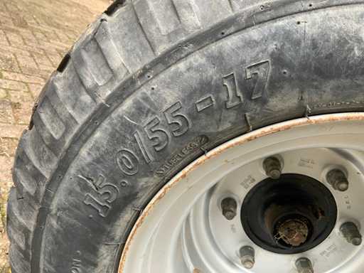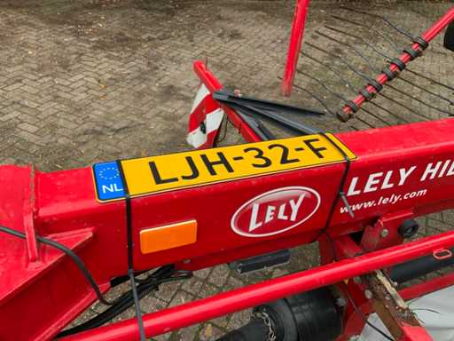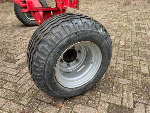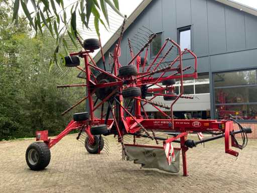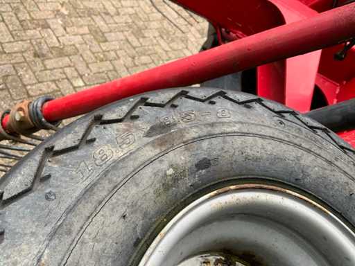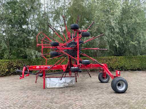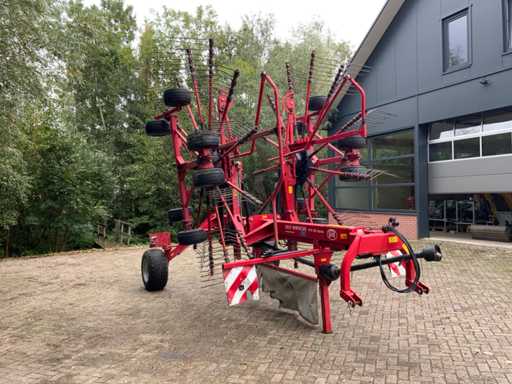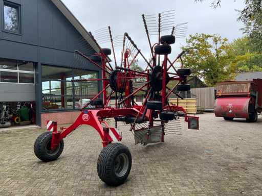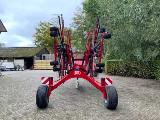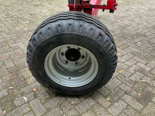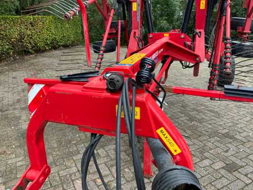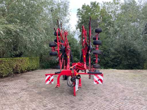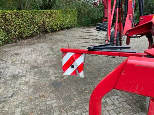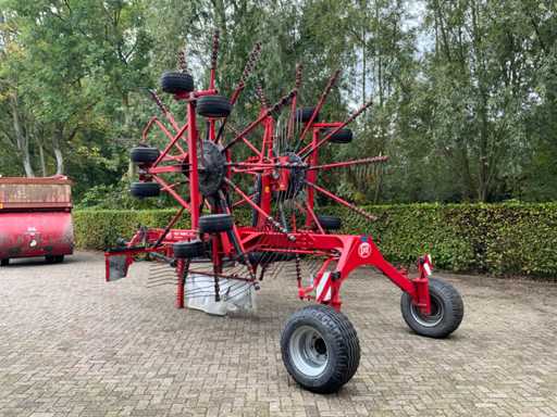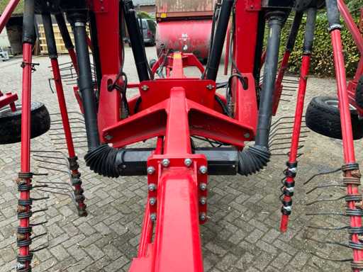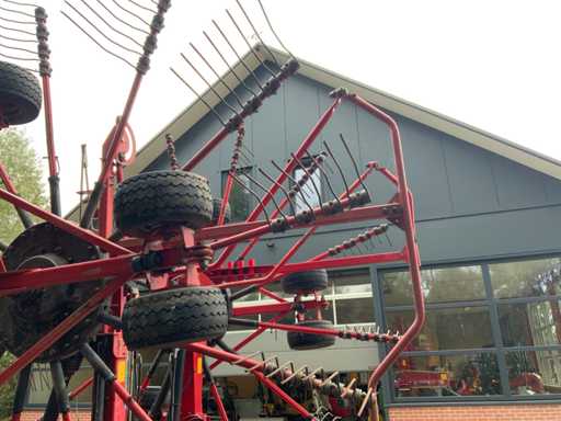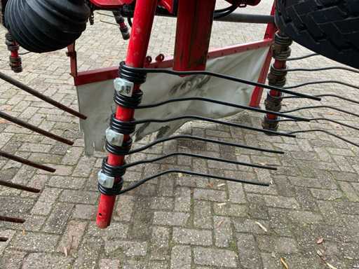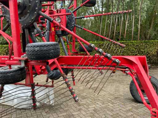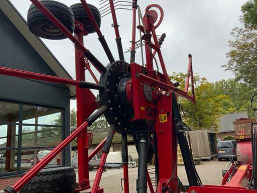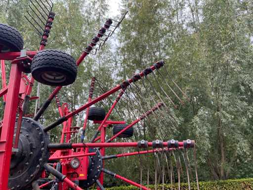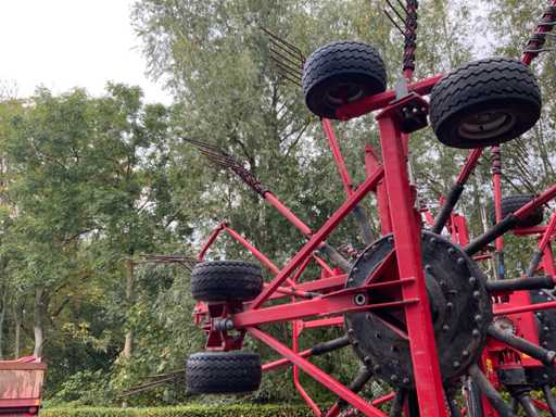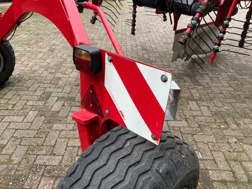 Equipped with support leg; PTO shaft (max 540); double-rotor rake with center delivery; per rotor 6 tyres (size 18.5x8.5-8) and 13 tine arms; Tire size 15.0/55-17