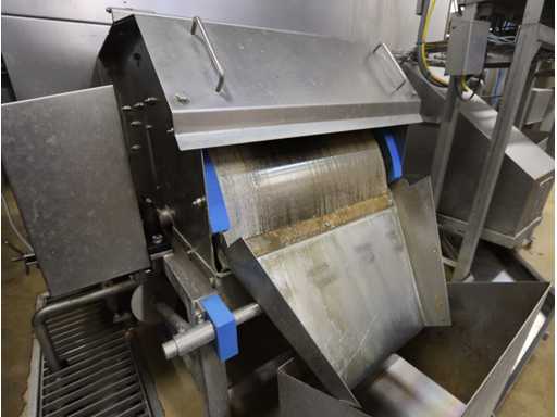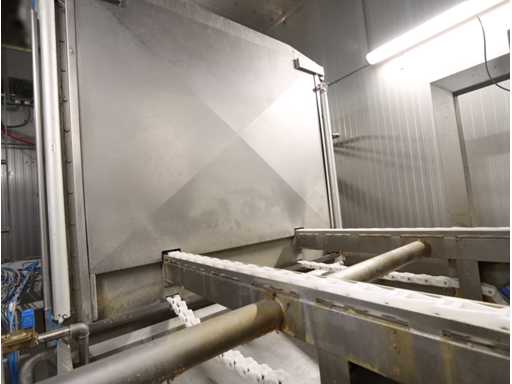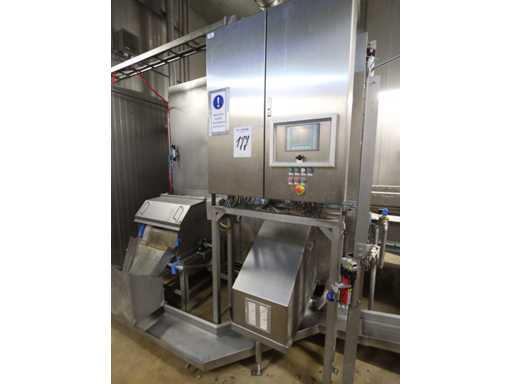 Steam heated, equipped with infeed conveyor belt, width 1100 mm, tilting device with infeed guide, outfeed sieve device, central switch cabinet with touchscreen control, chamber size 2500x1700x1300 mm,