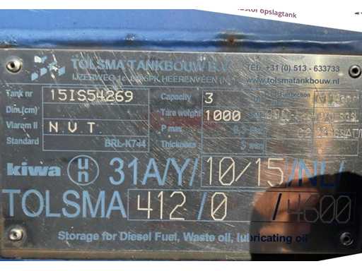 Capacity 3000 liters; lifting eyes; forklift fork slots; lifting eyes: flap without spring;