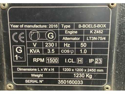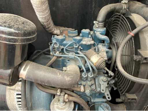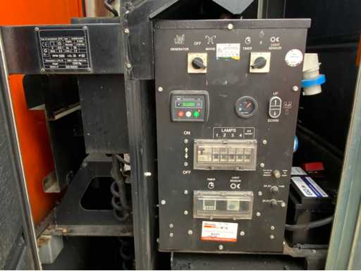 Kubota 2-cylinder diesel engine; alternator Linz alumen SB; 4x 300 Watt LED lamps; Hours 9358 hours; illuminated surface approximately 4000 m2; consumption 0.5 liters / hour at 100 load; hydraulic mast; Max. mast height 8.3 meters; light sensor; can be connected to 230 Volt mains power; tank capacity for 160 liters of fuel; forklift fork slots; lifting eyes; aluminium; various LED elements defective; engine running;