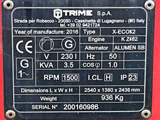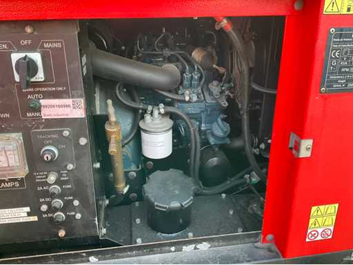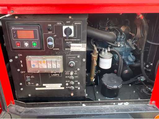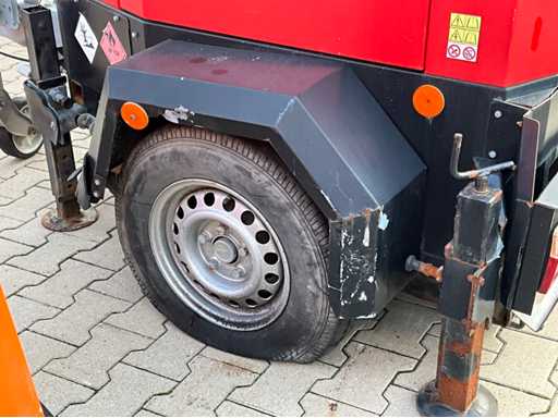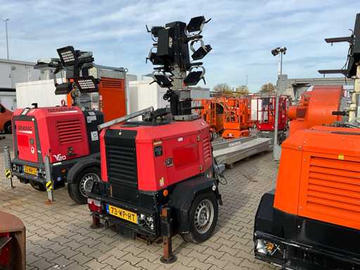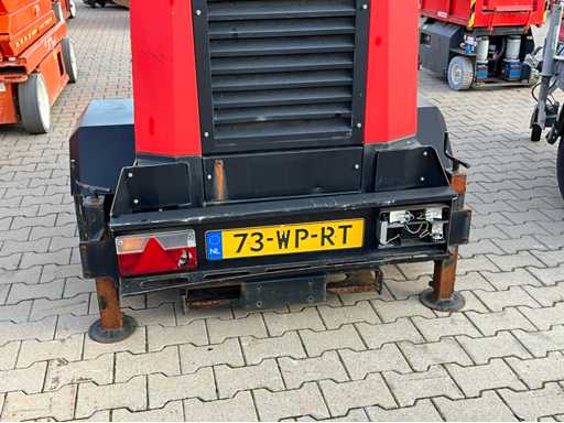 length 2540 mm; width 1380 mm; height 2430 mm; diesel engine; Alumen alternator; 6x150 Watt LED lamps; 230 Volts; 5 kVA; fuel tank 110 liters; hydraulic mast; maximum mast height approximately 8.5 metres; 3x adjustable foot; hours reading not readable; lifting eye; rear lights; without trailer coupling; not working; (the buyer must provide a valid registration number when transporting by road; a 7 or 9 pin connection plug or adapter with cable (extension cord can be purchased on site for a fee); possibly extra light bar; Dutch registration papers; certificate of conformity;
