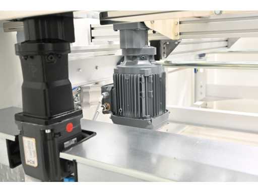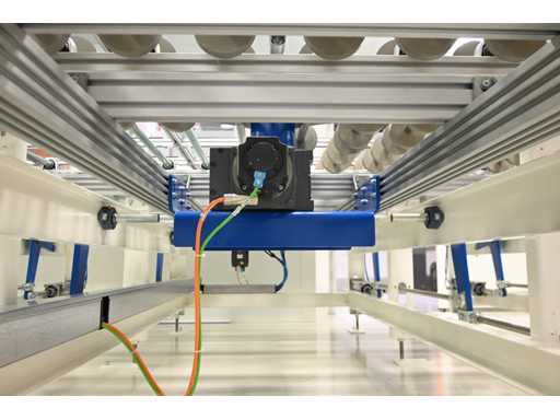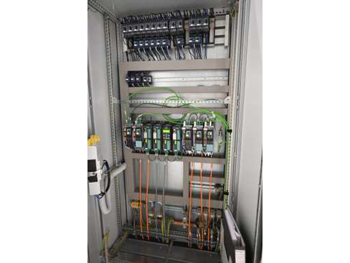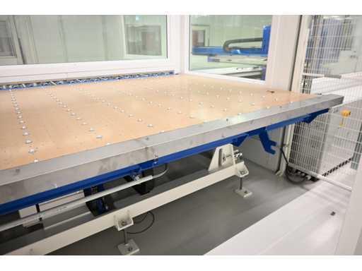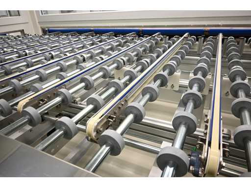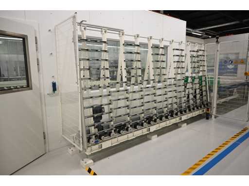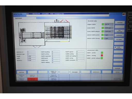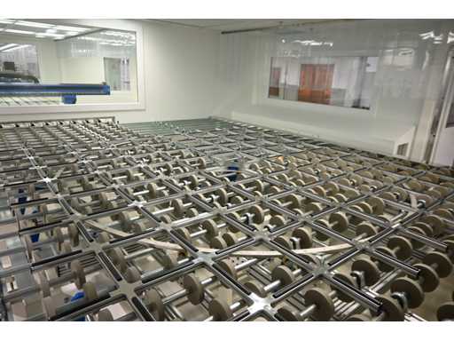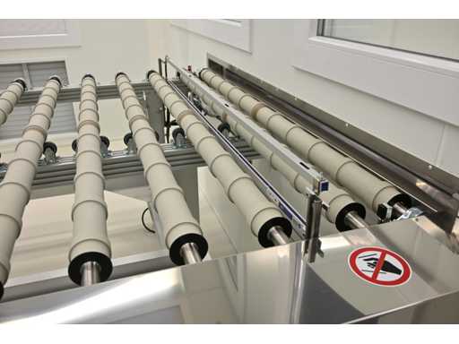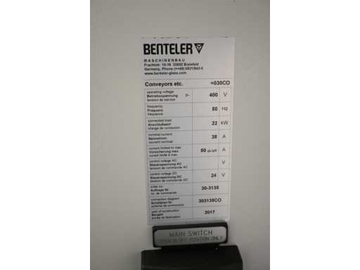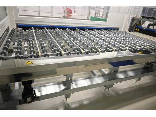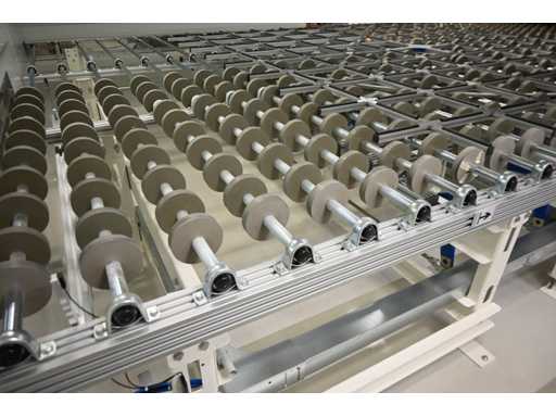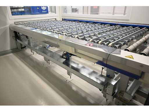 With Siemens Simatic HMI control system. Consisting of 1 x height-adjustable transport table that turns a vertical transport process into a horizontal transport process. Or from a horizontal transport process to a vertical transport process. Dimensions approx. L400 x W3950 x H1000 mm. Also 2 x Benteler Unloading conveyor height-adjustable transport table (Dimensions approx. L400 x W210 x H100cm and L550 x W210 x H100cm), 1 x Benteler Cross belt Conveyor height-adjustable transport table (Dimensions approx. L370 x W225 x H100 cm), Benteler tiltable ball roller height-adjustable transport table (Dimensions approx. L378 x W255 x H100 cm) and 1 x Benteler vertical glass side dispensing (Dimensions approx. L425 x W75 x H227cm. Machine investment: €220,000 excl. VAT. This lot is part of combination lot 221 (lot 201-220).