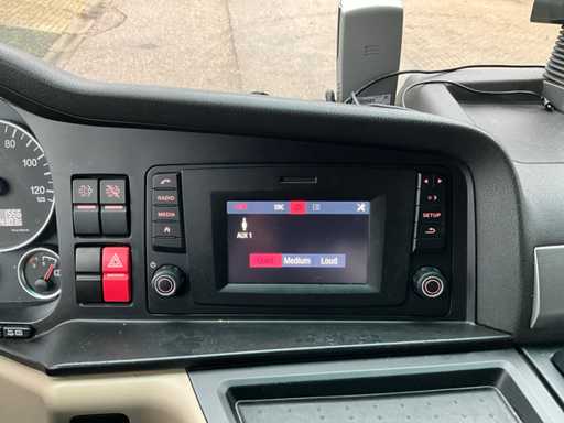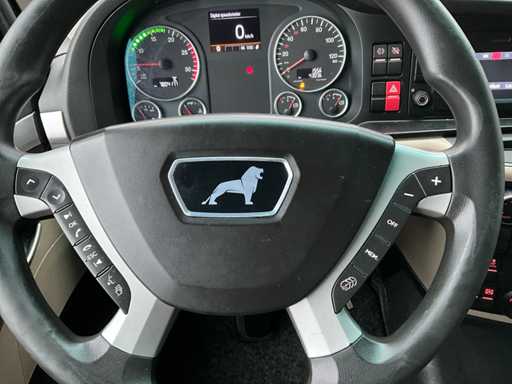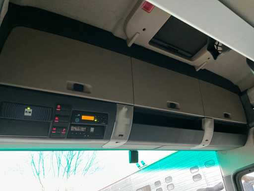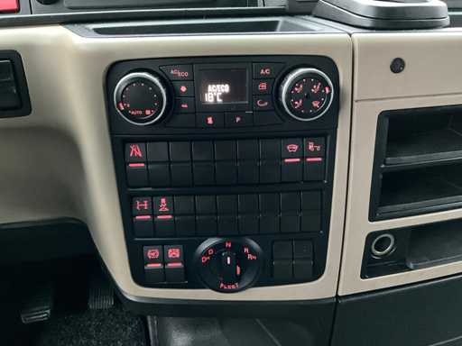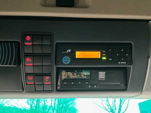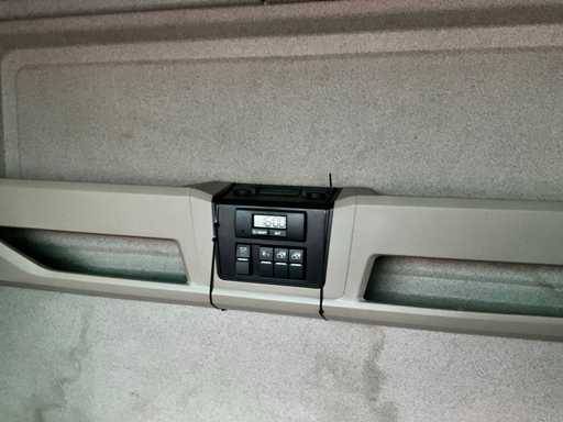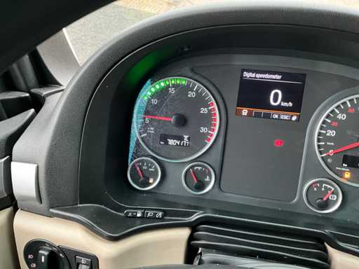 electric windows and mirrors, mirror heating, steering wheel controls, air conditioning, lock, digital tachograph, refrigerator, sleeping cabin, double fuel tank, starter breaker