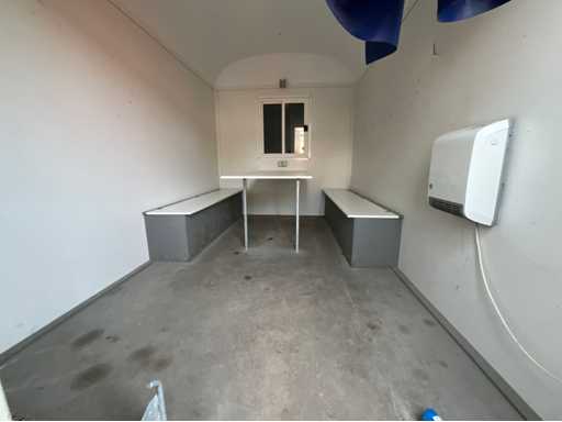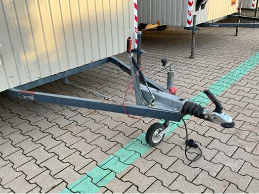 steel plate corpus; inhibited; jockey wheel; 4x adjustable foot; ball coupling and transport lights; 1x door; window fitted with galvanised steel shutter; table; 2x sofa; stove; (the buyer must provide a valid registration number when transporting by road; a 7 or 9 pin connection plug or adapter with cable (extension cord can be purchased on site for a fee); possibly extra light bar; German registration papers; certificate of conformity; (M-U3389)