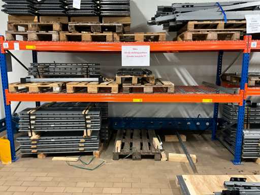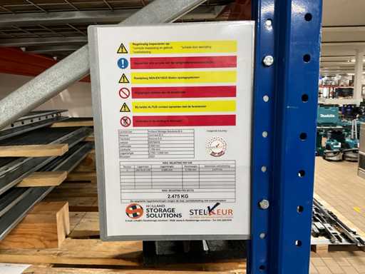 High rack: 2024 Esnova pallet rack (6 sections), 4 sections of 3600mm wide and 2 sections of 2700mm wide, 8x ER76M18 upright H3000mm and deep 1100mm load approximately 6000kg per section; Low racking: 2022 Esnova pallet racking (16 sections), 15 sections a 3600mm wide and 1 section a 2700mm wide; 28x Esnova ER76M18 upright 201cm high x 110cm; total 70x Esnova LNS-DUO 130 beam 3600mm, 6x Esnova LNS-DUO 130 beam 2700mm maximum load per section: 2475kg; including various wire shelves and various collision protection