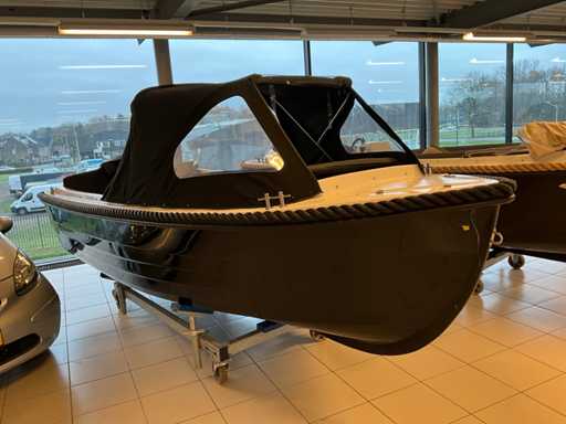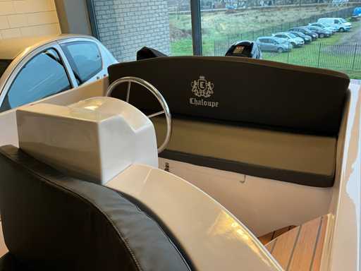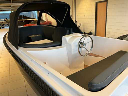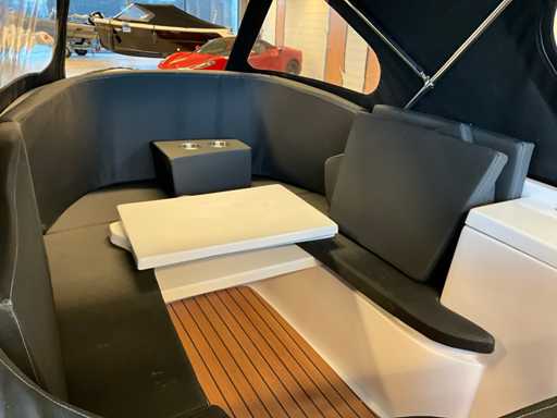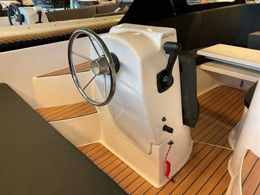 Color Black,white HPL floor, Anchor hatch lockable on foredeck, Spray hood with cover and storage cover, color: black, Cushion set & sundeck in anthracite color, Large storage spaces under benches, Navigation lighting & Top light, Switch panel with USB and 12 V, Battery, battery box, built-in main switch, Stainless steel bow arch, stainless steel cleats (6 x), Stainless steel cup holders, Steering console, Stainless steel steering wheel, Throttle, 12l tank