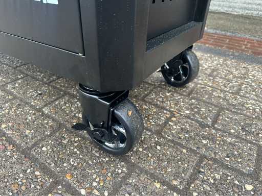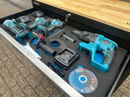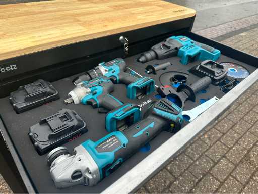 Provide; 6 drawers filled with tools and 1 drawer with power tools; 1 door; worksheet; chrome-vanadium tools; 5-inch wheels; 4 wheels of which 2 swivel wheels; handle; unused