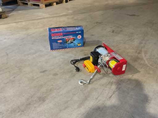Equipped with pulley; Motor power: 2700 W; Maximum Load Capacity (single/double cable): approx. 400kg/800kg; Maximum lifting height (400kg / 800kg): 12m / 6m; Gem. Lifting speed: 10 m/min; Connection: 230V; 1 x Electric Winch; 1 x pulley with hook; 1 x Mounting Brackets; 1 x Wired remote control 1.45; Unused in box (Dimensions transport packaging 430x190x260 mm lxwxh, weight 18.30 kg)