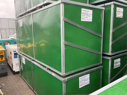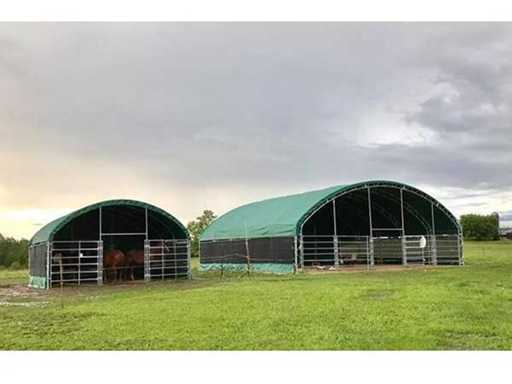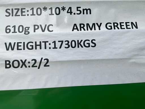 Equipped with fences all around, galvanized double truss/tube; space between arches 2.44 meters; tube size 60x1.5 mm; Purlin size 48x1.5 mm; fence 40x1.2 mm; with front door; material 610 grams, PVC tarpaulin, color green; manual available; For more info, see downloads; unused in 2 pieces of metal crates; Metal crate transport size: (lxwxh)