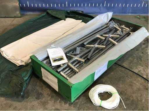 v.v. pvc tarpaulin 610 gr; color white; single truss; Galvanized Steel Frame Arches 45*1.5mm Purlin 32*1.2mm; space between arches 1.5 mtr; delivered in box 750x1920x340 mm; manual available; For more info, see Downloads © unused