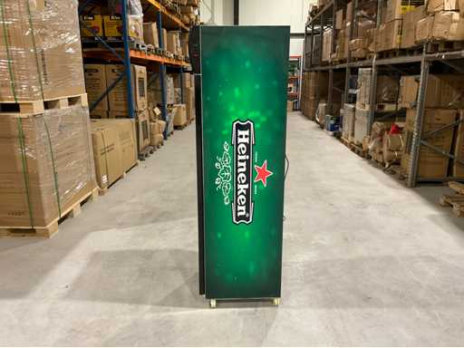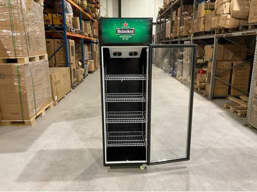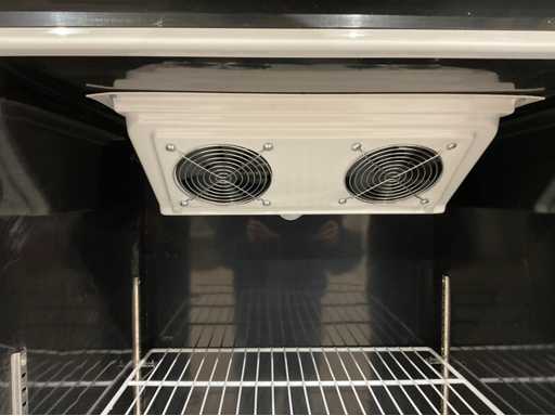 Equipped with glass door; 2 keys; lighting; 4 racks; swivel wheels; fan cooling; unused