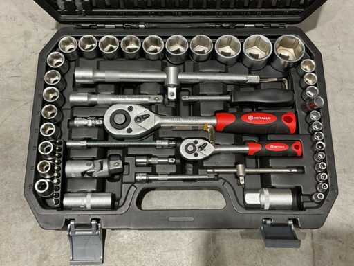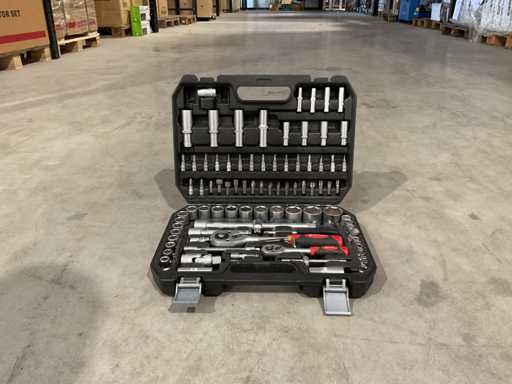Equipped with 13 x socket set DR6PTREG sizes 4-4.5-5-5.5-6-7-8-9-10-11-12-13-14; 8 1/4" DR6PT Deep Sockets Sizes: 6-7-8-9-10-11-12-13; 3 x 1/4" DRBIT Sockets: FD 4-5,5-7; 2 x 1/4" DRBIT Sockets: PH1-PH2; 2 x 1/4" DRBIT sockets: PZ1-PZ2; 4 x 1/4" DRBIT Sockets: HW 3-4-5-6; 6 x 1/4" DRBIT sockets: TX 8-10-15-20-25-30; 1 x 1/4" socket adapter; 1 x 1/4" DR Ratchet Wrench; 2 x 1/4" DR extension 2"-4"; 1 x 1/4" Adjustable T Wrench; 1 x 1/4" DR universal coupler; 1 x DR Spinner Key; 1 x DR Flexible spinner wrench; 18 x 1/2" DR6PTREG sockets: 10-11-12-13-14-15-16-17-18-19-20-21-22-23-24-27-30-32; 4 x 1/2" DR6PTDEEP sockets: 14-15-17-19; 2 x 1/2" DREXTENTION: 5-10'; 2 x 1/2" Spark Plug Wrench 16-21; 1 x 1/2" DR Universal Coupler; 1 x 1/2" DR 8 Hexagon bit coupler; 1 x 3/8" Fx1/2"M 3way adapter; 5 x Allen key 1.5-2-25 25-bit; plastic case; Unused in box