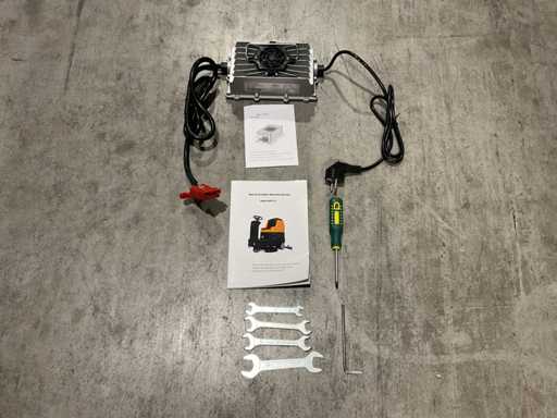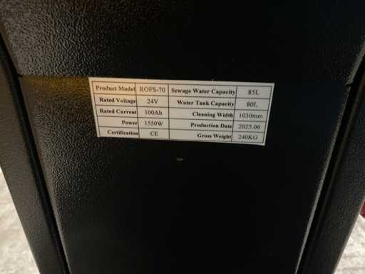 Provide; charger; manual; rated voltage 24V; rated current 100Ah; power 1550W; waste water capacity 85 liters; water tank capacity 80 liters; cleaning width 1030 mm; VT7001-7536; unused Transport sizes ; 146.5x75.5x135.5 cm; unused