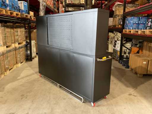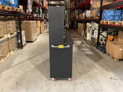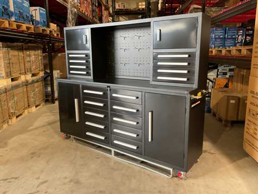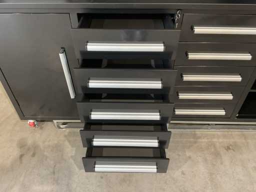 Equipped with powder-coated steel; 18 drawers; 4 standing cabinets; Keys for locking; Unused