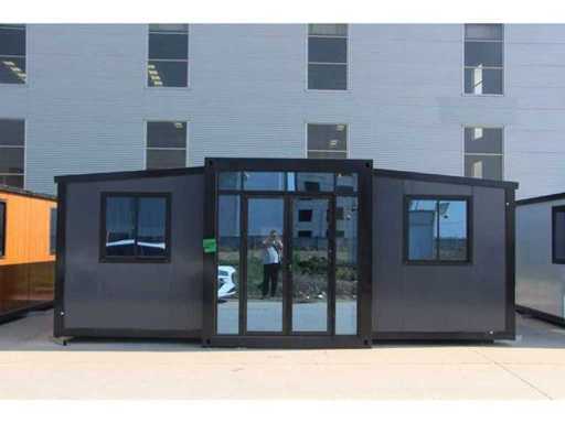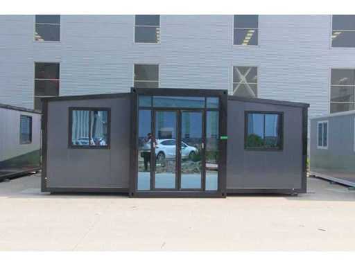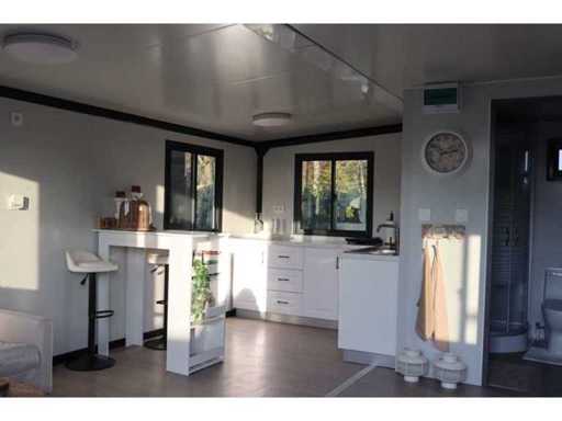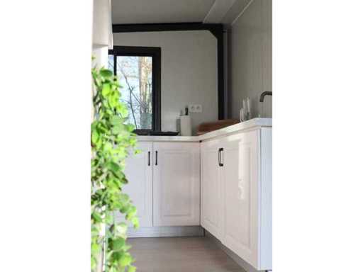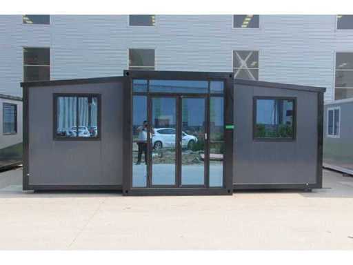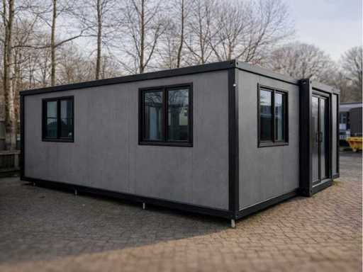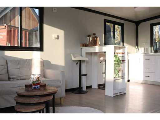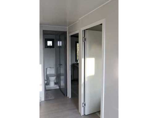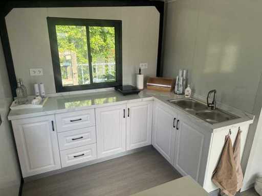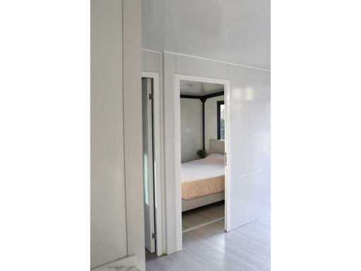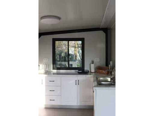 Equipped with pointed roof with balcony/canopy 2 meters long; insulated walls and roof; 2 bedrooms; living room with corner kitchen; bathroom with shower, toilet and sink; each room equipped with lighting and sockets 230V; meter cupboard; PVC floor; aluminum windows and doors; lockable; water, electricity and drainage can be easily connected is prepared; unused and ready for transport (note furniture not included) (transport dimensions 590x220x248 cm, weight 3100 kg)